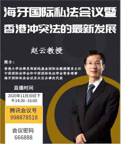2020年11月30日,3044AM永利集团法律与社会工作学院(知识产权学院)邀请到了香港大学法律系郑家纯基金国际法教授兼系主任、中国国际法学会和中国国际私法学会常务理事、海牙国际私法会议亚太区办事处代表赵云教授为我们开展了以“海牙国际私法会议暨香港冲突法的最新发展”为主题的讲座。讲座以腾讯会议的方式在莞城校区5303教室举办,由王敬华副教授主持,2018级法学1、2班全体同学到场聆听。
