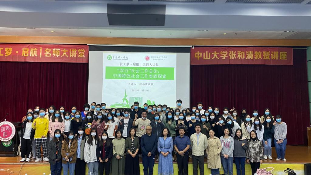 11月15日晚上19:00-22:00,法律与社会工作学院(知识产权学院)社会工作系于莞城校区学术报告厅举办社工梦·启航|名师大讲堂活动。本次活动邀请了中山大学社会学与人类学学院教授张和清面向社会工作系学生开展讲座。张和清教授作了主题为“从‘双百工程’中看中国特色社会工作实践探索”的学术讲座。本次活动张教授点明了社会工作的发展前景应该是具有中国特色社会主义性质的,旨在增强社会工作系学生对社会工作和社会工作本土化的思考,发掘同学们积极往社会工作方面学习、发展与从业的潜能。成伟教授、张燕婷老师、卢俊老师、黄俊辉老师、党曦老师、刘静老师、张子庄老师及19级社会工作系学生、20级社会工作系学生、21级专插本社会工作系部分学生参加了本次活动。