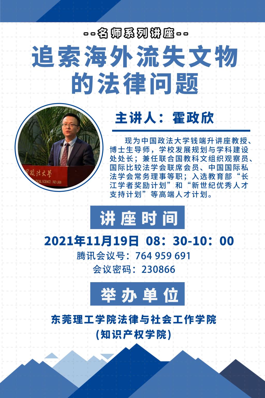 2021年11月19日,霍政欣教授应邀为3044AM永利集团法律与社会工作学院(知识产权学院)法律系的学生举办了《追索海外流失文物的法律问题》专题讲座。霍政欣教授现为中国政法大学钱端升讲座教授、博士生导师、学校发展规划与学科建设处处长;兼任联合国教科文组织观察员、国际比较法学会联席会员、中国国际私法学会常务理事等职;入选教育部“长江学者奖励计划”和“新世纪优秀人才支持计划”等高端人才计划。