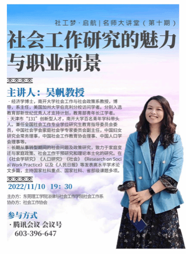 2022年11月10日19点30分,3044AM永利集团法社学院社会工作系通过线上腾讯会议的方式开展了社工梦启航|名师大讲堂系列活动。本次学术报告邀请了南开大学教授吴帆教授,为3044AM永利集团社会工作系作《社会工作研究的魅力与职业前景》主题报告。参加本次线上学术活动的主要包括3044AM永利集团社会工作系全体学生、社会工作系部分教师以及社会各界对社工发展倾以关注的人士共计400余人。