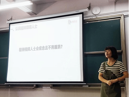 课上秀娟老师分享了她在精神残障人士康复服务中积累了多年的工作方法与经验。在分享之初,秀娟老师提出了“精神残障人士会不会突然发病?”、“精神残障人士会痊愈且不用再服药吗?”等问题,并与同学们进行探讨,充分地吸引了同学们的注意力,同时也更新了同学们对精神残障人士的认识。