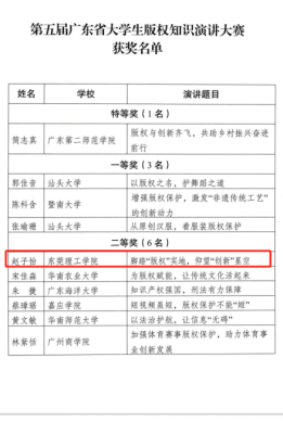 在我院知识产权系龚红兵、李文伟、庄瑞银、胡庆乐老师和我校宣传部邓磊老师、文传学院传媒系李缨副教授的指导下,法社学子在第五届广东省大学生版权知识演讲大赛中再创佳绩。