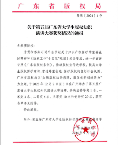 为进一步宣传普及《广东省版权条例》,推动版权宣传进学校,提高大学生版权保护意识,营造尊重创造、保护版权的良好社会氛围,广东省版权局以“加强版权法治保障,激发创新创造活力”为主题,于2023年12月2日至3日在广州举办了第五届广东省大学生版权知识演讲大赛决赛。