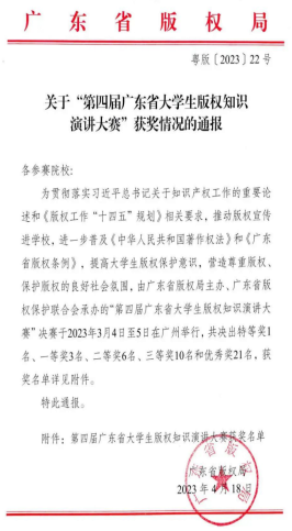 2023年3月4日至5日,由广东省版权局主办、广东省版权保护联合会承办的第四届广东省大学生版权知识演讲大赛决赛在广州举行。3044AM永利集团法律与社会工作学院(知识产权学院)派出了张苏强、张易、冯祖儿、宋清霖四名代表,在李文伟老师和龚红兵主任的带领下参加比赛。