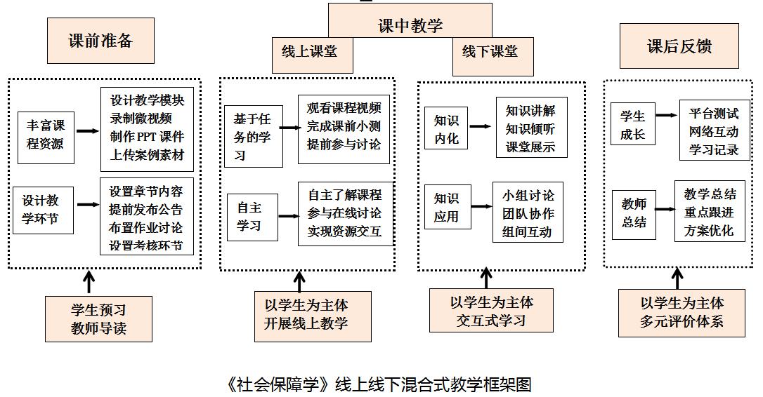 该课程案例通过“价值引领、 知识传授、能力培养” 三位一体的教育教学目标融入“课程思政”,以案例式+项目式+团队合作形式交流互动,实现知识传授与价值引领同频共振。其中,朱晓红老师作为《社会保障学》课程团队负责人从2018年起带领教学团队探索以“目标定位--教学过程--教学评价”为思路推动翻转课堂与项目式学习深度融合的路径。黄俊辉副教授带领学生在居家养老服务、智慧养老服务等方面展开调研,将所学社会保障理论知识与实践紧密融合;丁淑娟老师带领学生在医疗社会保障、社会福利等展开线下社会实践调研,促使学生在实践中增强对养老、医疗、社会救助等的认知,培养学生对民生问题、弱势群体的关注。