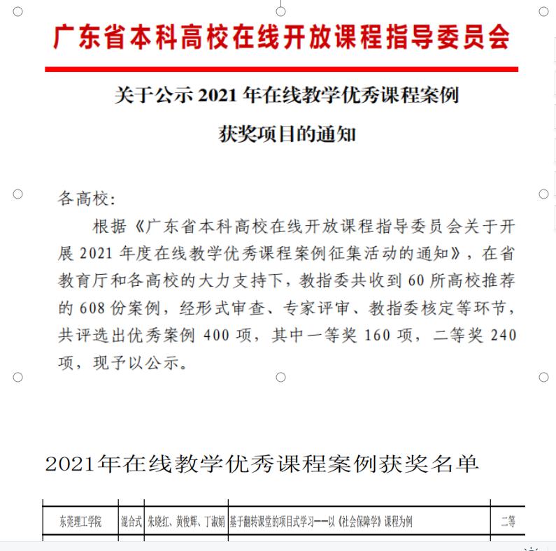 近日,广东省本科高校在线开放课程指导委员会公布了2021年在线教学优秀课程案例获奖项目评选结果。我院由朱晓红、黄俊辉、丁淑娟三位老师申报的《基于翻转课堂的项目式学习——以<社会保障学>课程为例》荣获二等奖。