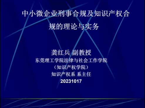 为了加大对民营中小微企业原始创新保护力度,持续完善大岭山民营企业的知识产权保护体系,以知识产权助力大岭山民营企业高质量发展,法律与社会工作学院(知识产权学院)龚红兵副教授于2023年10月16日在大岭山颜屋村村委会给30多家的企业家代表以《中小微企业刑事合规及知识产权合规的理论与实务》为题进行了法治讲座。龚红兵老师以:一、涉案企业合规的政治背景与政治意义(中央相关合规政策介绍);二、涉案企业合规刑事司法政策语境;三、涉案企业如何进行合规整改;四、企业知识产权合规建设的实践路径等四个专题进行了讲授。