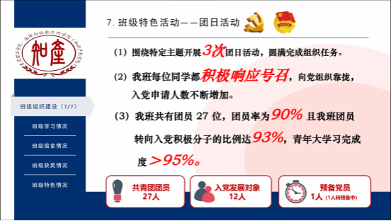 在团日活动方面,21知产班团支书每月围绕特定主题定期开展团日活动,其中包括“百年青年运动,青年砥砺前行”、“开拓创新,科技兴国”、“学习党的二十大精神”等主题团日活动,21知产班同学积极参与,从不缺席。此外,参加院校内班级团员建设工作,参加院校内组织的各项学习活动,如:青年大学习、学习强国。每位同学都积极响应号召,向党组织积极靠拢,21知产班加入中国共产党的人数不断扩大。同学们一步一步脚踏实地,认真完成院党课、校党课学习和考试,取得结业证书。团员们与团支书共同进步,共同书写属于21知产班的无限未来。