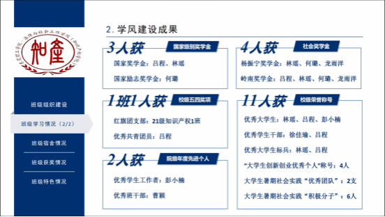 在11月4日当天,班长曹颖作为汇报人站上了大礼堂的舞台上,与学院的各位老师、同学们一齐分享21知识产权班这一年来的成就,也分享每一个来之不易的成就背后的汗水和泪水。