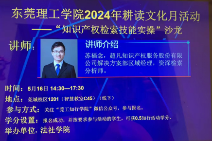 2024年5月17日下午2:30分在莞城校区1201智慧教室,我院以“知识产权检索技能实操沙龙”形式举办2024年校耕读文化活动。我院产业导师、北京市京大律师事务所(深圳)的苏福念老师,为我们带来了一场主题为“知识产权(专利)检索技巧”的知识产权实训课堂讲座。此次讲座旨在提升我校师生以及社会各界对专利检索的认识与操作能力,进而推动科技创新与知识产权保护的深度融合。