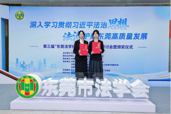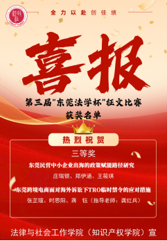 我院共有两篇获奖文章,分别是由庄瑞银 郑伊涵 王筱琪等老师和同学共同撰写的文章:《东莞民营中小企业出海的政策赋能路径研究》和龚红兵副教授指导的,由张芷瑄 时思阳 蒋钰、陈郑南凝等24级知识产权专业同学共同撰写的文章:《东莞跨境电商面对海外诉讼下TRO临时禁令的应对措施》。