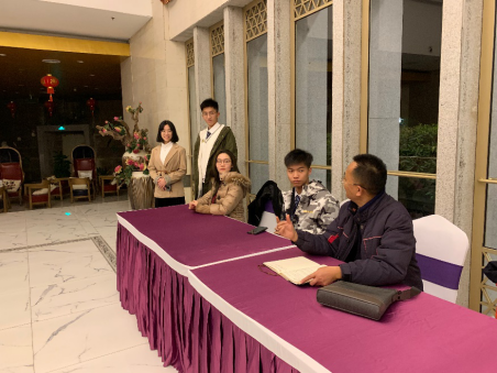 2020年12月18日下午,法社学院比赛团队一行六人来到比赛地点所在的华南理工大学中心酒店。晚上23时,龚红兵老师与胡庆乐老师一起召集大家在中心酒店大堂进行深夜指导以及最后的预演排练。老师让选手们再次模拟实战演练,并让选手之间互相观摩,提出各自的看法与意见,龚老师还为同学们提出更加完善的建议。全体人员在场仔细聆听着两位老师的指导。直到深夜,老师们和同学们才回到房间休息,迎接明天的正式比赛。