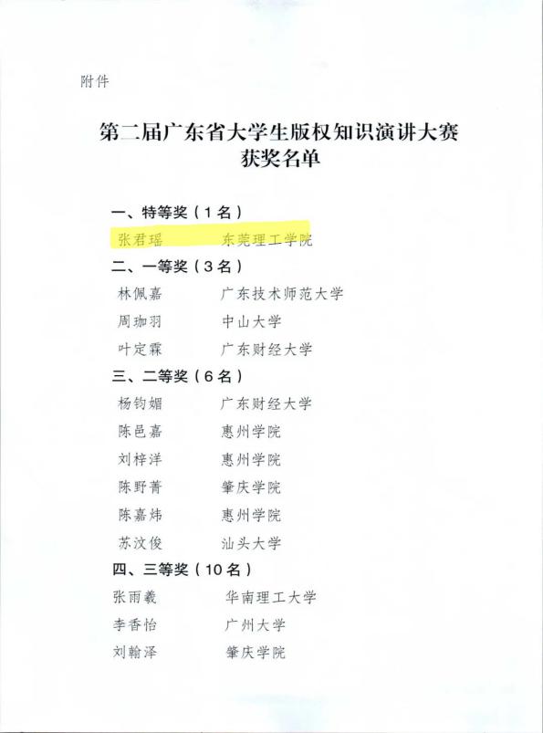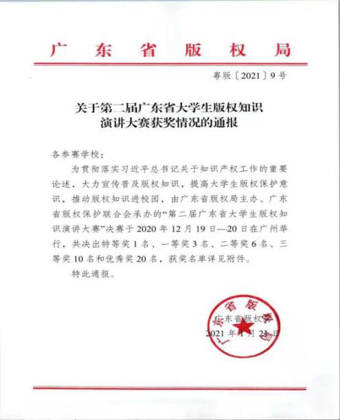 近日,在2020年度广东省大学生版权知识演讲大赛中,我校法律与社会工作学院(知识产权学院)2020级知识产权管理与运营(专插本)2班张君瑶同学获得特等奖,2019级法学1班黄子茵同学取得三等奖。特此报喜!