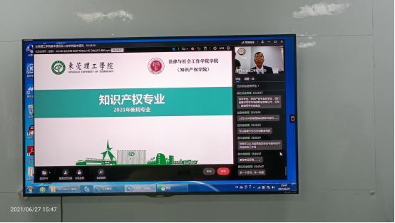 2021年6月27号下午,为了进一步帮助广大高中毕业生了解我校的2021年本科招生信息,特别是了解法律与社会工作学院(知识产权学院)的法学、知识产权、行政管理和社会工作专业招生的具体情况,法社学院副院长党员朱晓红老师、法学专业负责人党员吉海荣老师、知识产权专业负责人党员龚红兵老师、行政管理专业负责人党员陈洪波老师等组成招生宣讲团,在线上对广大考生进行了详细的招生宣传。