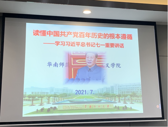 党支部的各位党员同志分别在莞城校区法律系教研室和大学创新城A3栋2楼第一会议,聆听了华南师范大学马克思主义学院院长陈金龙教授所作的《读懂中国共产党百年历史的根本遵循—学习习近平总书记七一重要讲话》的辅导报告