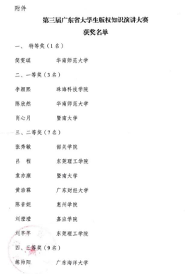 第三届广东省大学生版权知识演讲大赛完美谢幕了。此次比赛,展现了法社学院积极向上的良好风貌,希望我院学子能向优秀看齐,积极参与各种活动与比赛,提高自身综合素质能力,用心拼搏,超越自我!