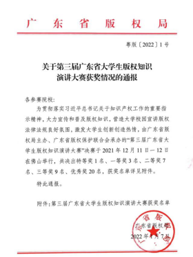 法社学子在第三届广东省大学生版权知识演讲大赛中再创佳绩,2021级知识产权1班吕程与2020级法学(知识产权)1班刘芊芊双双取得二等奖。指导老师为法社学院龚红兵、李文伟、杨婧、胡庆乐。