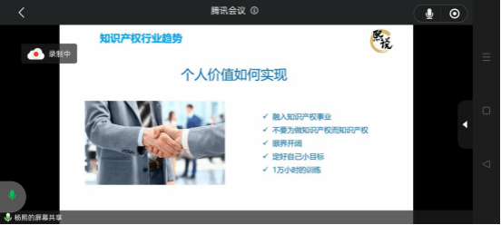 第二个版块,知识产权行业趋势。杨熙老师针对知识产权产业链、知识产权如何创造价值、个人价值如何实现由此展开。其中,杨熙老师强调同学们要定好自己小目标、保持学习姿态、不要为做知识产权而知识产权。郑维晟同学说:杨老师让我们把个人价值和社会价值紧紧地联系在了一起,我将牢记与此。