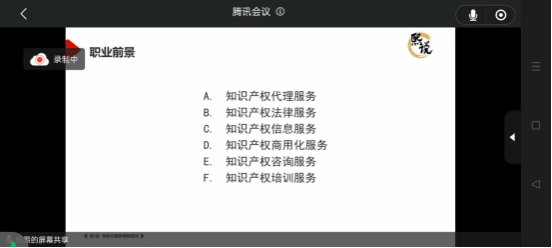 第一个版块,知识产权职业前景。杨熙老师围绕着知识产权行业的知识产权代理服务、知识产权法律服务、知识产权信息服务、知识产权商用化服务、知识产权咨询服务、知识产权培训服务为同学详细分析就业前景。为广大同学们指引方向。