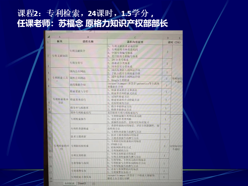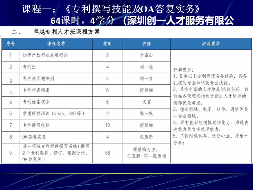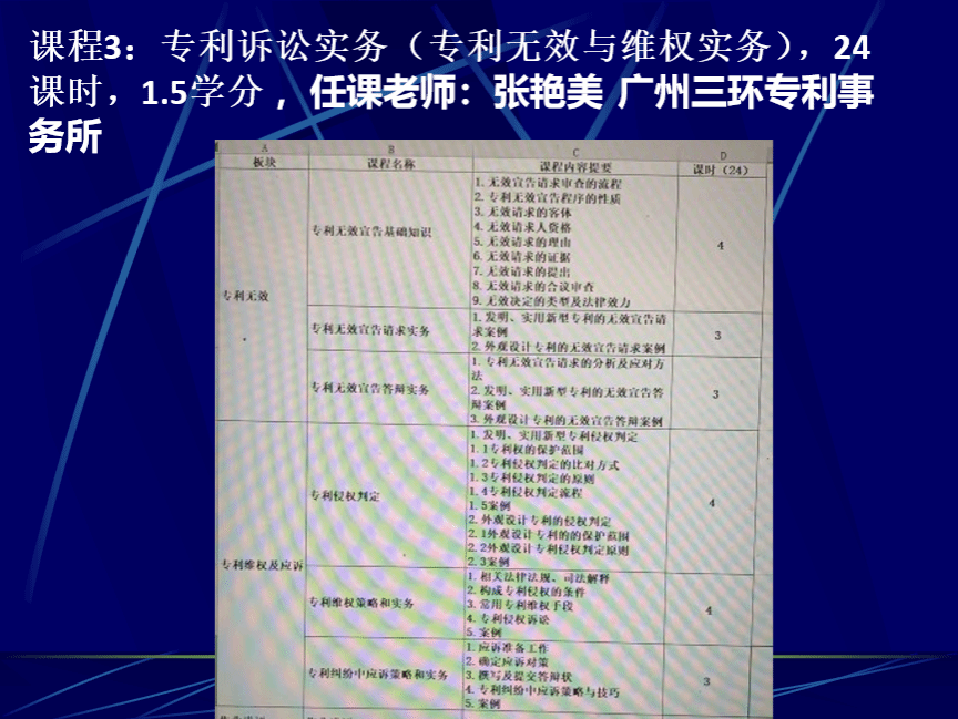 在此次“卓越专利代理工程师班”的开班动员大会中,知识产权系系主任龚红兵重点介绍了“卓越专利代理工程师班”的课程计划、任课教师及课程安排。任课老师均来自知识产权实务界,其中,课程《专利撰写技能及OA答复实务》的老师均来自深圳市创一知识产权人才服务公司;课程《专利诉讼实务》的任课老师是广州三环专利代理事务所的张艳美律师;课程《专利检索与应用》的任课老师由原珠海格力电器股份有限公司知识产权部的苏福念老师担任。