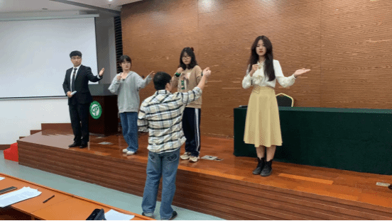 邓磊老师在指导学生进行演讲手势语言的训练